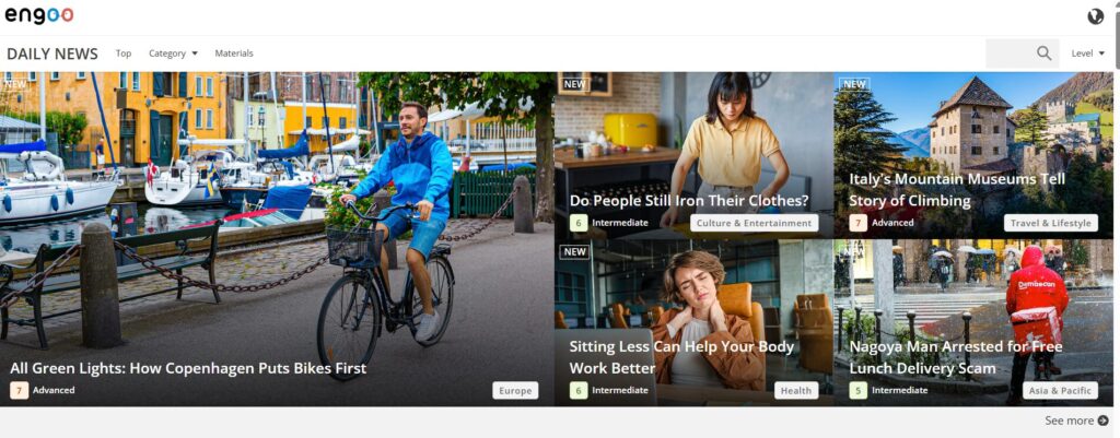 今回の、トピックであるEngoo Daily Newsは最低難易度が5からスタートとします。初心者である場合は、Beginnerレベルとして、文法学習や、英会話を学ぶページから始めることができるので安心。