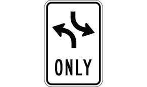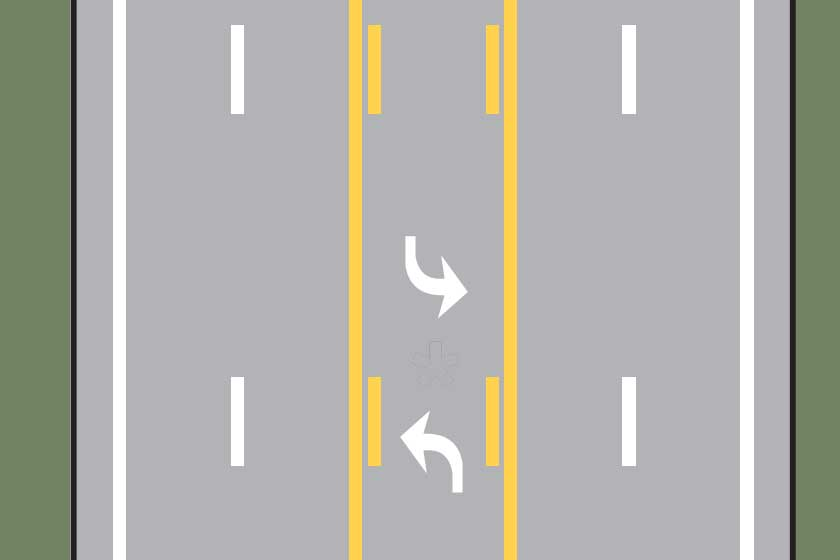 この標識は近くに、「双方向共有左折レーン」を意味し、左折することによって引き起こされる渋滞を、軽減するために右図のような道路が近くに配置されていることを示しています。