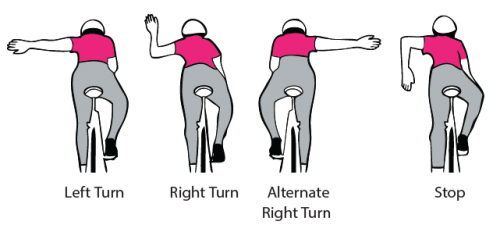 その為、基本は車道を走り左折右折の際には左下図のようなハンドサインが必須となっております。