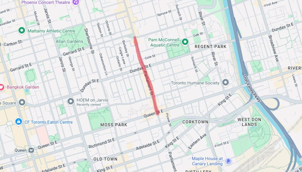 この赤線の通り、「Sherbourne St のDundas〜Gerrard の間とDundas〜Queen 」の間が避けるべきエリアだと言われております。
